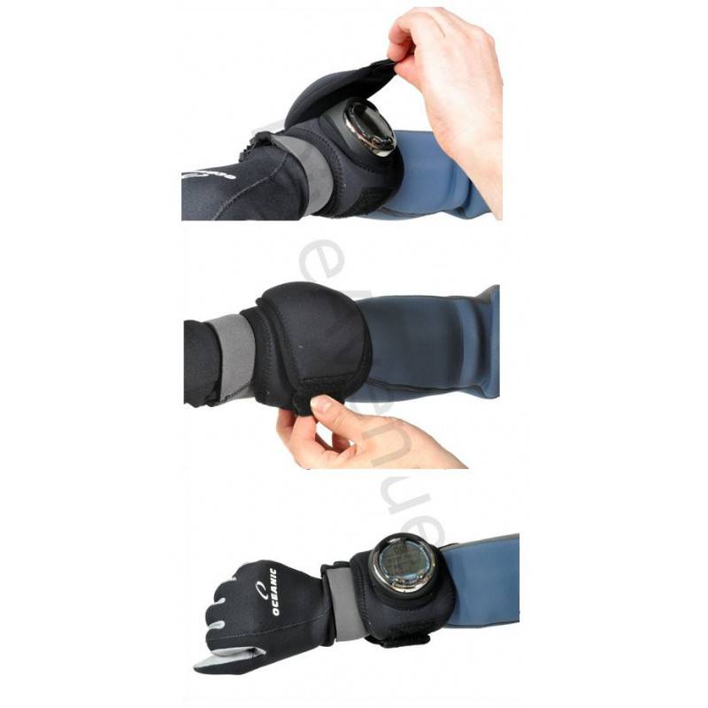 2. Soulevez le "volet de protection" et venez faire le tour du poignet par l'arrière afin de le fixer au velcro inférieur. Il ne bougera plus durant la plongée.