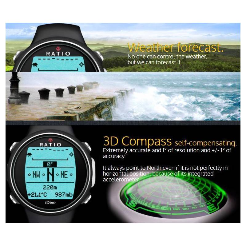 Comme sur toute la gamme des Ratio iDive il dispose d'applications comme la boussole 3D, l'altimètre, les prévisions météo, une fonction de remise en forme, etc.