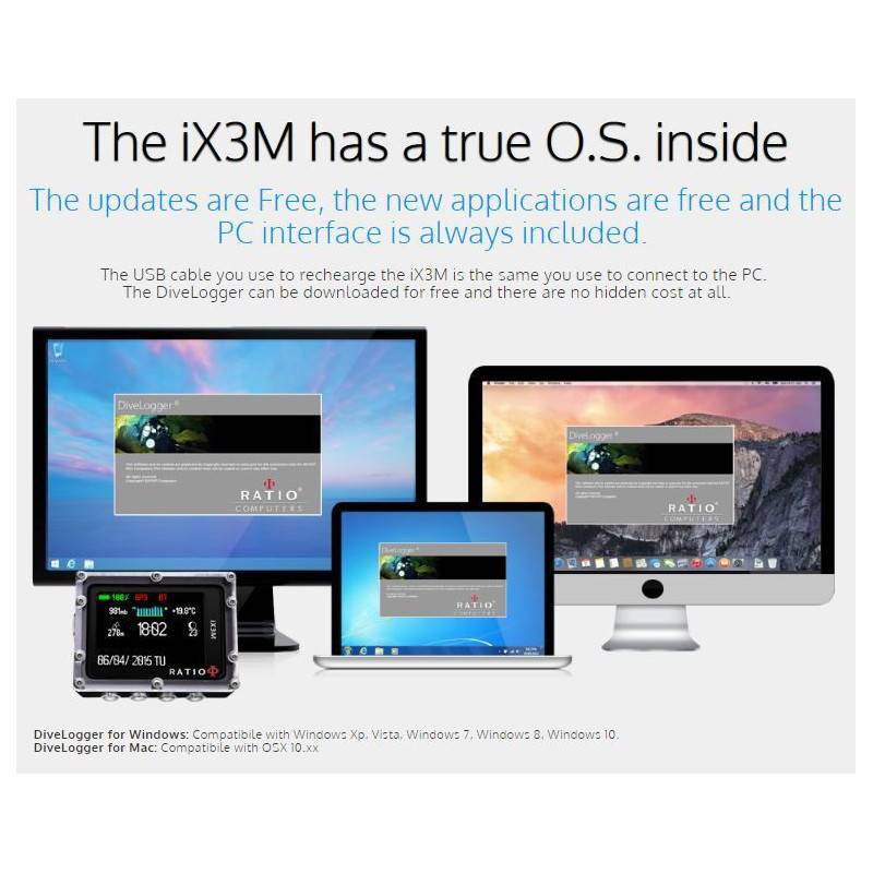 Vous pouvez connecter le Ratio IX3M2Tech+ à votre ordinateur sous Windows ou Mac par son cable USB ou par Bluetooth avec son interace DiveLogger.