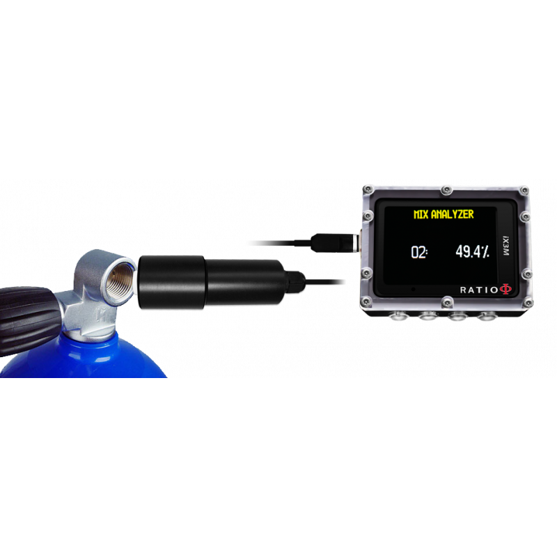L'analyseur d'oxygène Ratio est une première mondiale. Branchez-le simplement sur votre ordinateur de plongée Ratio iDive et iX3M et indiquez-lui avant la plongée le taux d'oxygène de votre bouteille.