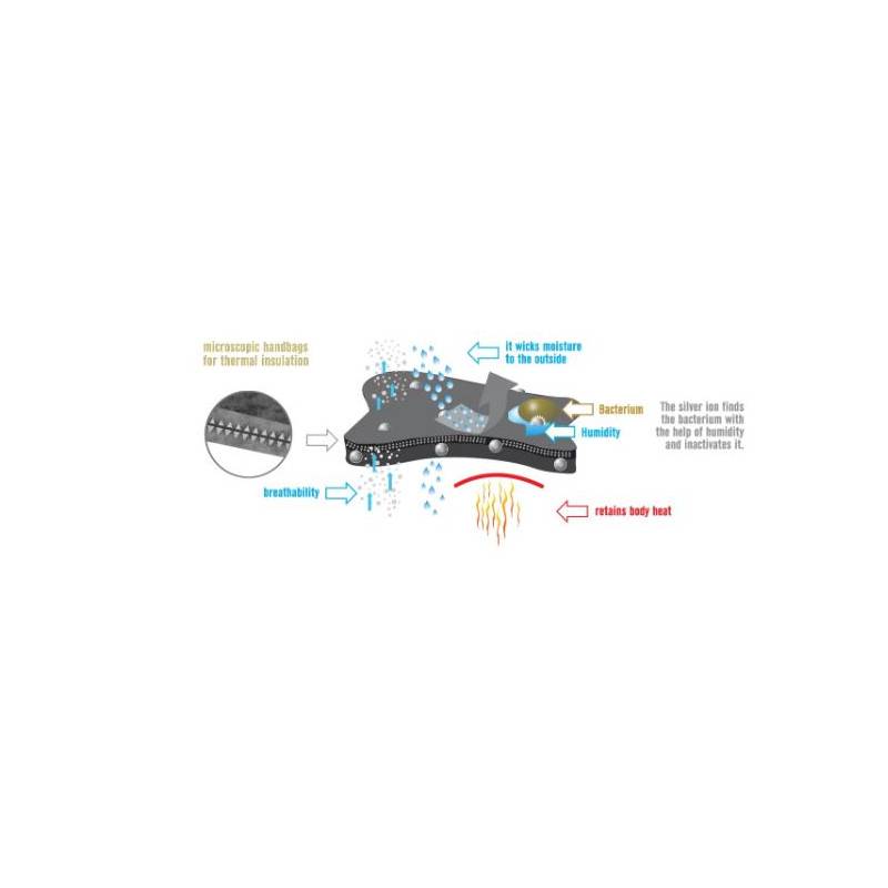 Les bactéries se nourrissent de la sueur sécrétée pendant l'exercice et sont responsables de l'odeur désagréable et caractéristique d'ammoniac chez une personne en sueur. Les ions d'argent stabilisent la quantité de bactéries sur la peau et les propriétés thermoactives du matériau permettent à la sueur de s'échapper de la surface de la peau, où elle s'évapore correctement et ne peut plus servir de terrain de reproduction pour les bactéries. Le risque d'allergies et la formation d'odeurs désagréables sont ainsi éliminés.