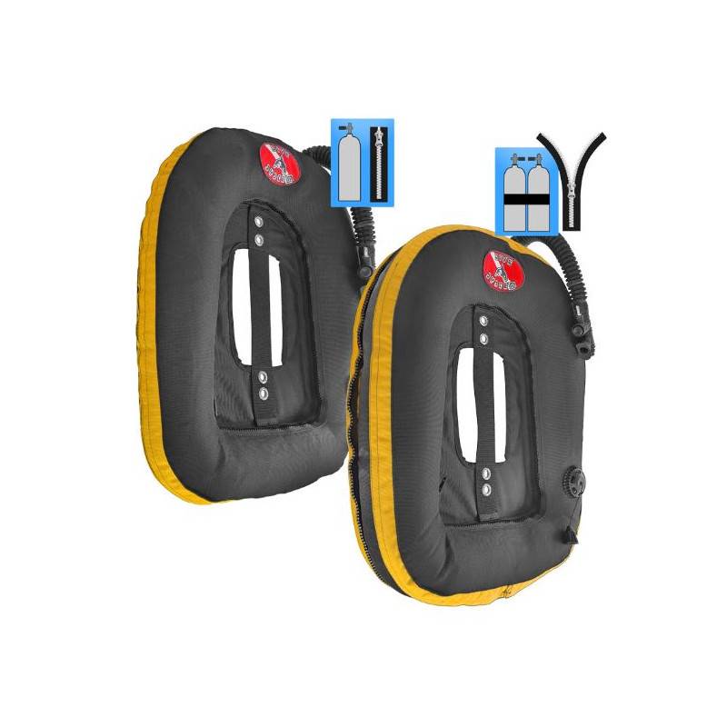 Ce Quickly MoBi peut donc être utilisé avec un mono et un bi-bouteilles. En effet, il suffit d'ouvrir ou de fermer la fermeture éclair périmétrique pour passer d'une flottabilité Mono à une flottabilité Bi. La forme variable et l'entraxe du sac MoBi vous permettent d'utiliser des cylindres Mono et Bi-bouteilles tout en maintenant la wing bien ajustés contre la bouteille et sans "flottement" inutile.
