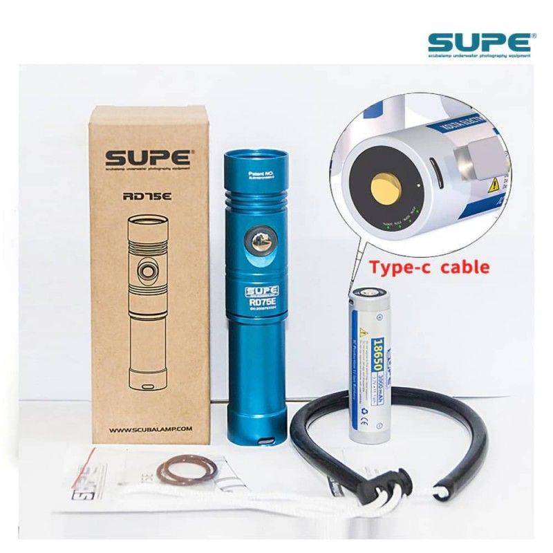 La RD75E de chez Supe a été testée jusqu'à 100 m et cette lampe utilise une batterie Li-Ion 18650 (incluse), l'autonomie peut s'étendre jusqu'à 2 à 6 heures. Une seule charge, une journée de plongée.