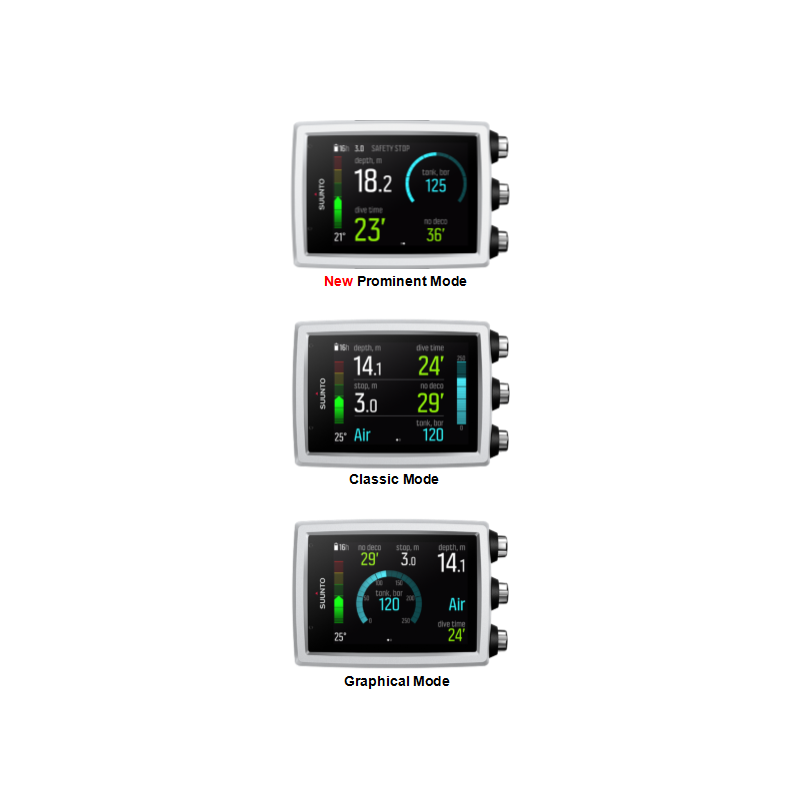 - Si vous êtes un plongeur débutant, vous pouvez choisir les écrans par défaut clairs et prêts à l'emploi pour votre plongée. Pour les plongeurs plus avancés, Suunto CustomDisplay ™ permet de modifier les caractéristiques affichées sur jusqu'à quatre affichages différents afin de répondre à vos préférences personnelles de plongée.