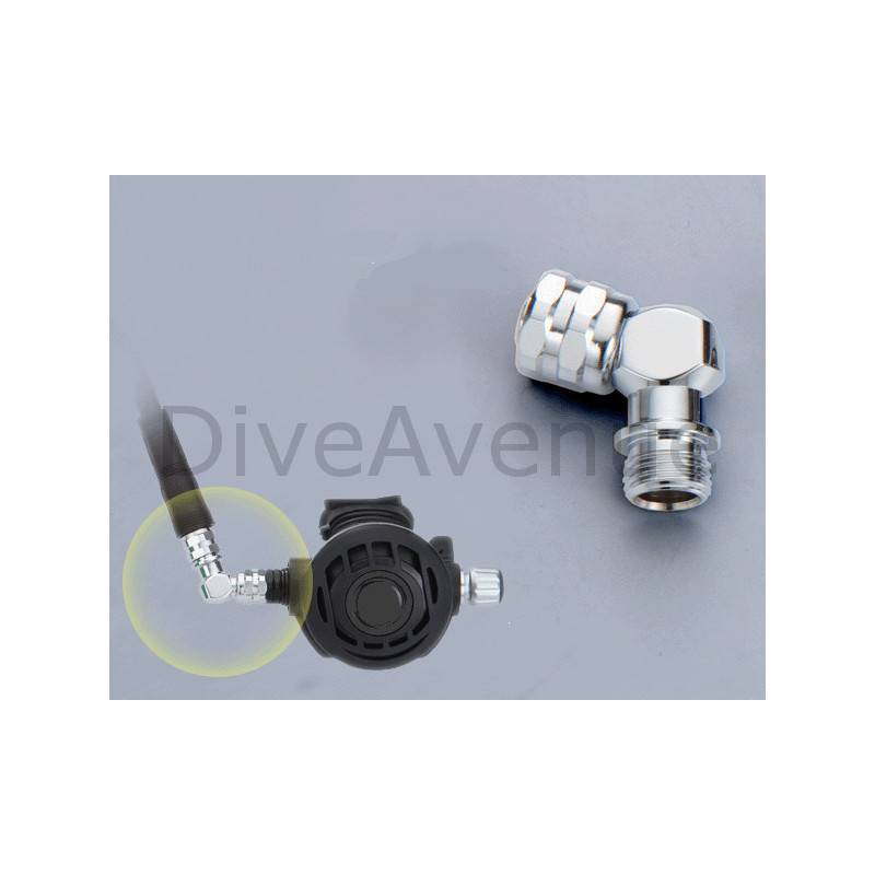 Ce coude à 110° d'angle se fixe entre le deuxième étage du détendeur et son flexible fileté en 9/16'-18.
